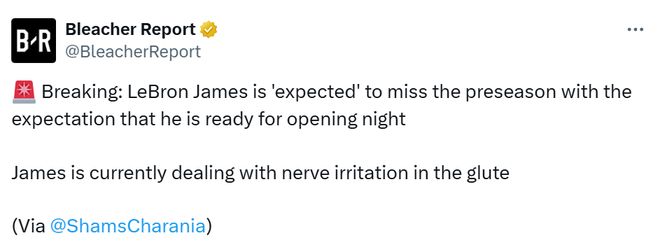 Shams说道:“我得知勒布朗-詹姆斯目前已开始增加训练强度,在球场上进行一些训练。但我也了解到,目前的预期仍是他可能会缺席整个季前赛。球队的目标是让他做好准备,迎接10月21日对阵金州勇士队的揭幕战。所以他在球场上的训练内容增多了,也开始参与更多篮球相关活动,但至于常规赛开始前他能否打一场比赛,还有待观察。”