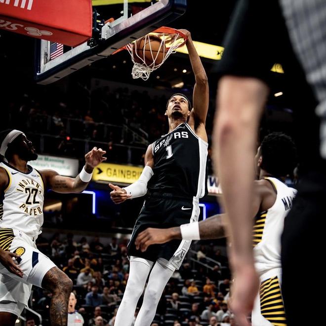 在首节7分多钟的上场时间内,文班亚马4投4中高效轰下10分4篮板2助攻1抢断1盖帽,撞开步行者悍将杰克逊并且双手暴扣太蛮横。